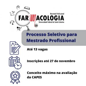 A Coordenação do Mestrado Profissional em Farmacologia (MPFMC), do Centro de Ciências Biológicas, da Universidade Federal de Santa Catarina, faz saber que entre 05 de setembro e 27 de novembro de 2025 estará aberta a inscrição para o processo de seleção e admissão para a turma 2026.