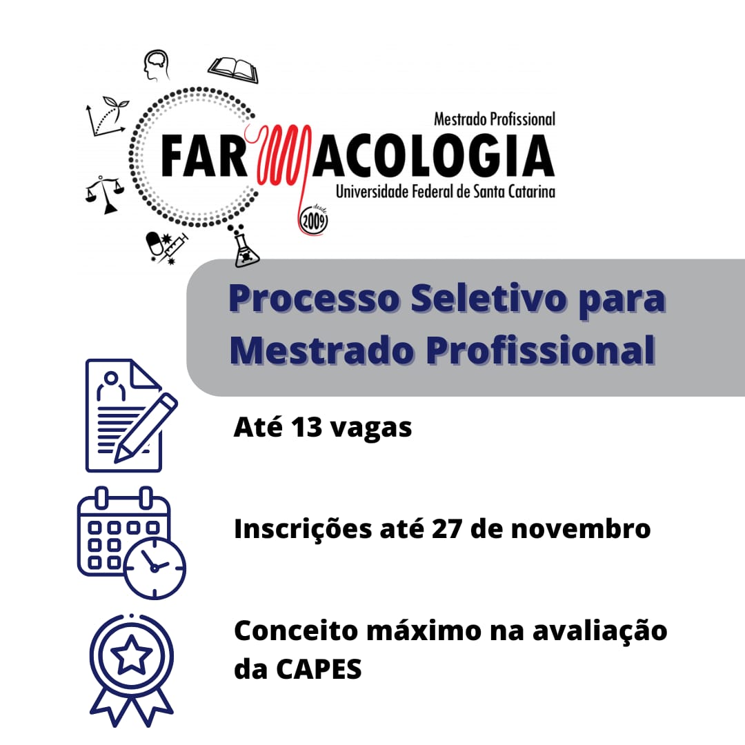 A Coordenação do Mestrado Profissional em Farmacologia (MPFMC), do Centro de Ciências Biológicas, da Universidade Federal de Santa Catarina, faz saber que entre 05 de setembro e 27 de novembro de 2025 estará aberta a inscrição para o processo de seleção e admissão para a turma 2026.